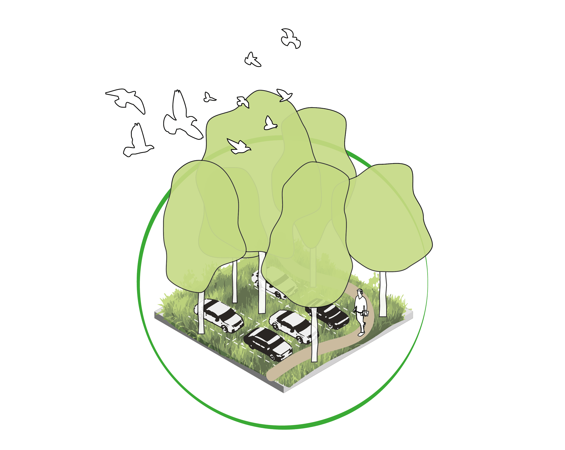 Parkeren onder en tussen de bomen. Slim vormgegeven waarbij de suggestie wordt gewekt dat de bomen er altijd al hebben gestaan en de auto’s duidelijk te gast zijn. In een parkeerbos wordt er ruimte gemaakt voor bomen, in combinatie met een struik- en kruidlaag. In plaats van asfalt wordt er zoveel mogelijk halfverharding met een groene informele uitstraling toegepast. Er worden duidelijke looproutes met voetgangerspaden gemaakt en het autoverkeer wordt op een veilige en overzichtelijke manier ontsloten.
