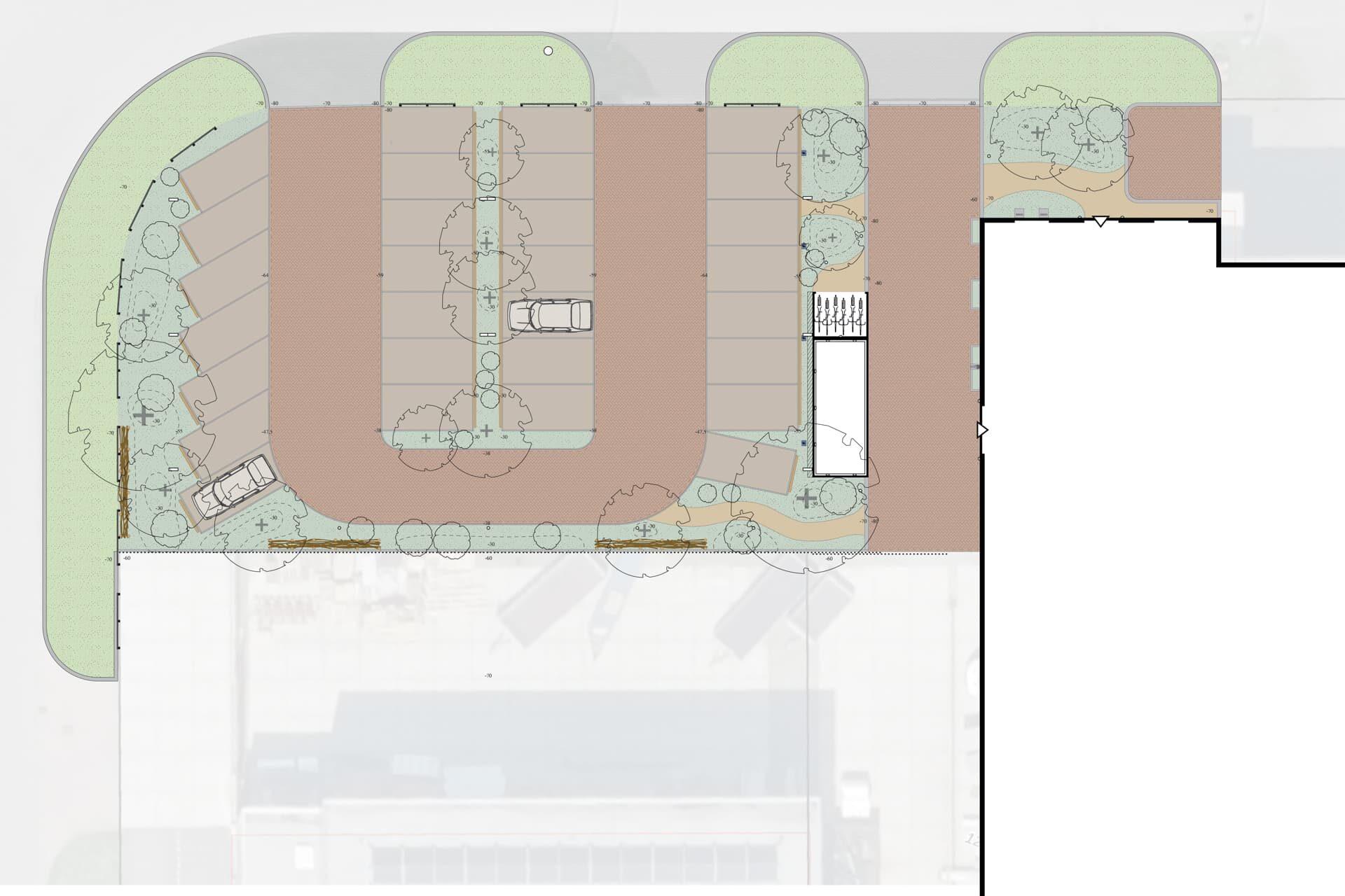 Het Parkeerbos combineert functionaliteit met een natuurlijke, duurzame inrichting. Door lichte hoogteverschillen en ophopingen van grond, in combinatie met een speelse indeling van de parkeervakken ontstaat er een parkeerterrein met een groen en natuurlijk karakter.