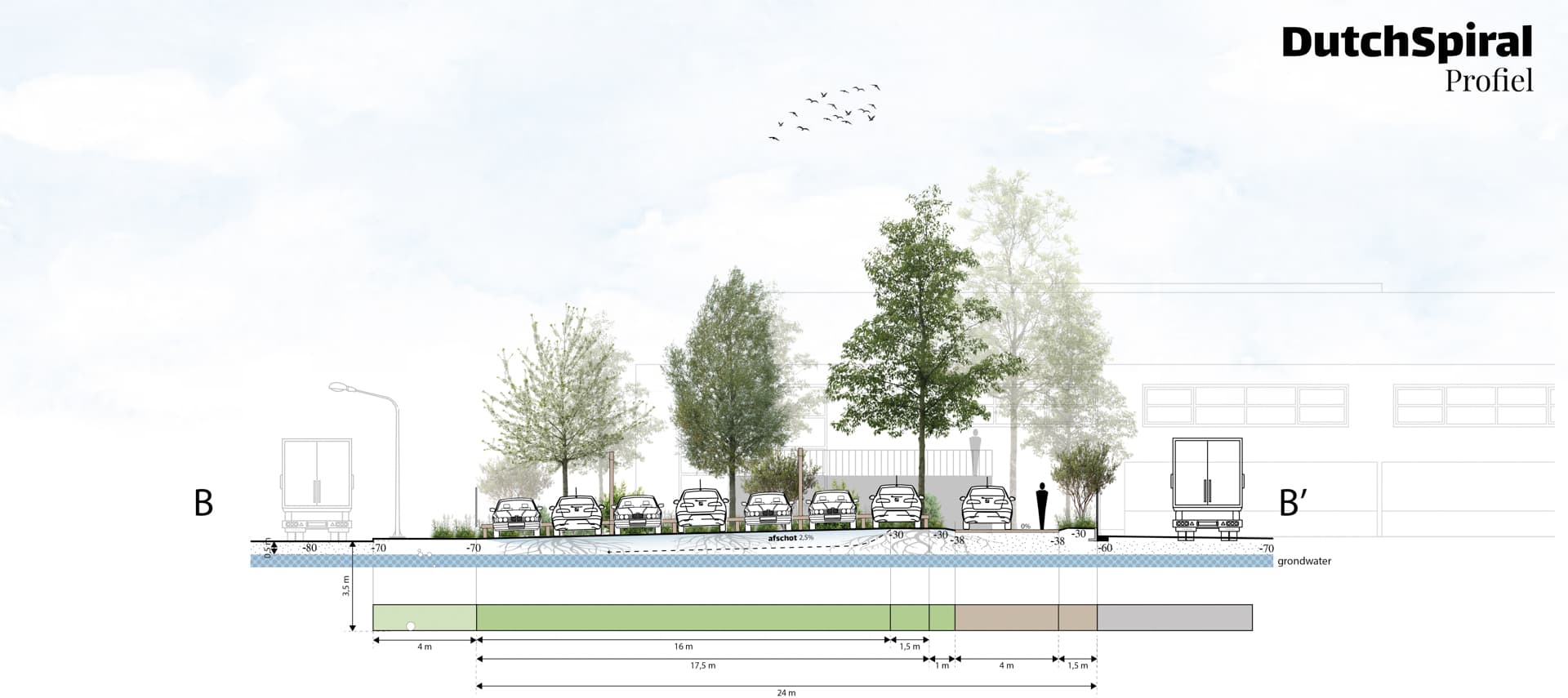 Voor Dutch Spiral hebben wij een versteend bedrijfsperceel getransformeerd tot een indrukwekkend Parkeerbos; een boomrijk en levendig stukje buitenruimte waar aangenaam geparkeerd kan worden. Hier ontmoeten functionaliteit en natuur elkaar: de parkeerplekken liggen tussen bomen die schaduw bieden, de omgeving verkoelen en een prettig uitzicht creëren. Zo voelt parkeren niet langer als iets alledaags, maar als een moment van opladen voor mens én dier.