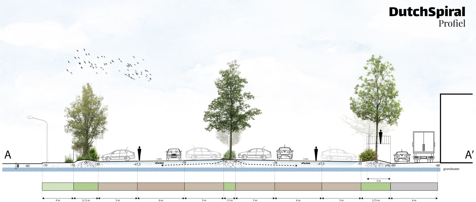 Bij de inrichting van het Parkeerbos is veel aandacht besteed aan groeiplaatsvoorzieningen, om zo gezonde en volwassen bomen te kunnen garanderen. de grondwaterstand is hoog, wat resulteert in beperkte doorwortelbare ruimte voor bomen in dit natte polderlandschap. We hebben daarom het maaiveld licht verhoogd om zo de doorwortelbare ruimte te vergroten. Het bomengranulaat waarmee wordt opgehoogd zorgt voor extra ‘sponswerking’ en voldoende zuurstof in de bodem. Het bomengranulaat in combinatie met drukverdelend doek, verhoogd ook het draagvermogen van de grond, waardoor auto’s prima kunnen parkeren onder de bomen zonder daarbij de wortels te beschadigen. Het nieuwe reliëf draagt bij aan het creëren van een natuurlijk ogende glooiende bosvloer. Zo krijgen bomen de kans om zich goed te ontwikkelen, terwijl het parkeeroppervlak functioneel en duurzaam blijft.