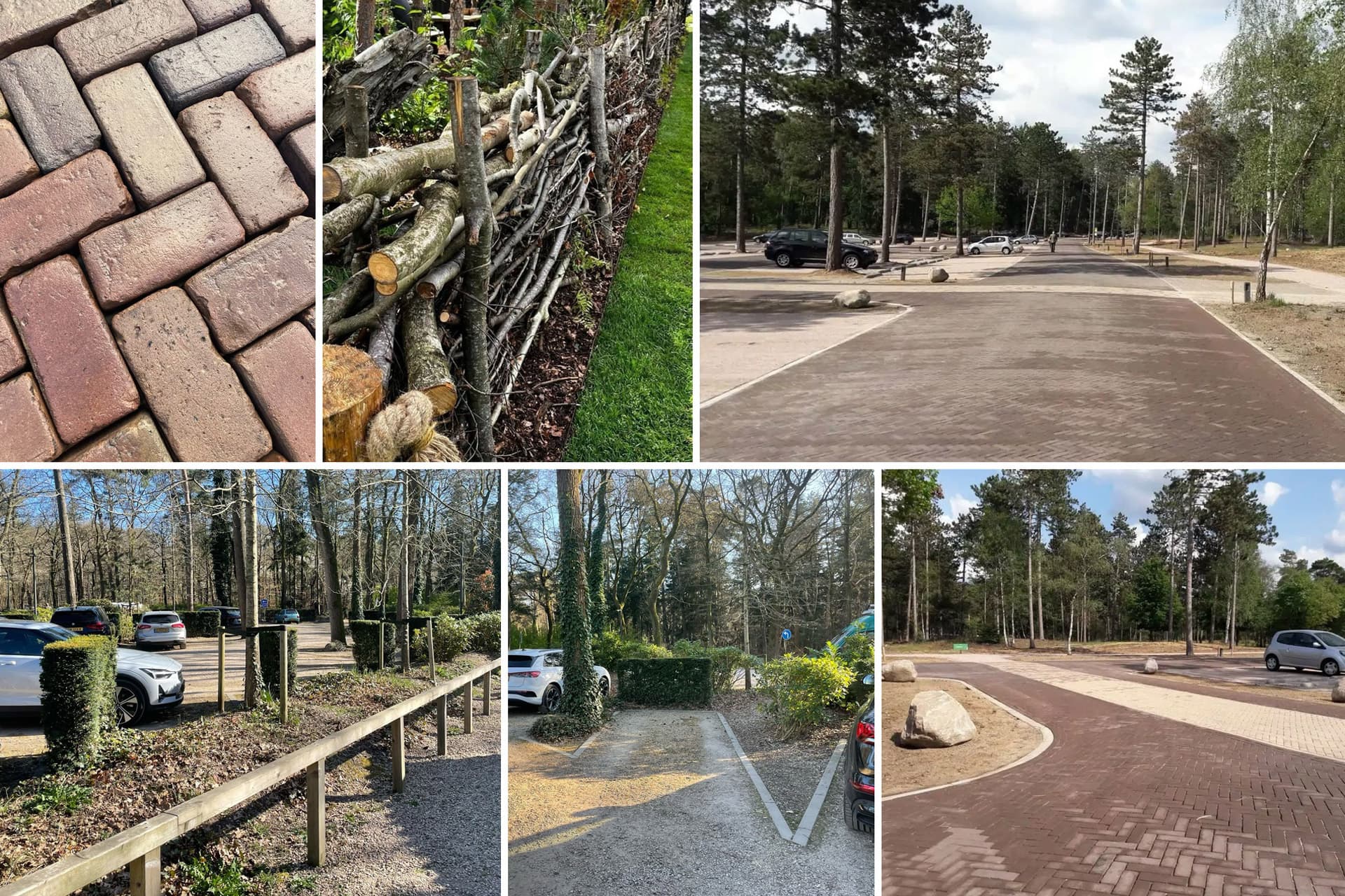 De verharding bestaat uit oud gebakken kleiklinkers in warme tinten van bont tot brons. Hun doorleefde uitstraling en natuurlijke kleur versterken het karakter van het parkeerbos, dat meer aanvoelt als een landschap dan als een parkeerplaats.